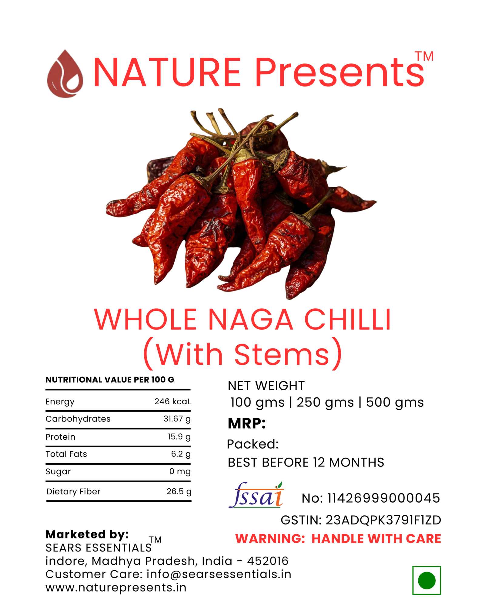 Renowned as one of the hottest chillies in the world, Naga Chilli packs a fiery punch that is perfect for those who crave bold, intense flavors. Its heat level is a testament to its unmatched quality and authenticity. Naga Chillis we offer has a SHU (Scoville Heat Unit) of almost 1 Million Units which is approx. 100 times spicier than normal red chilli